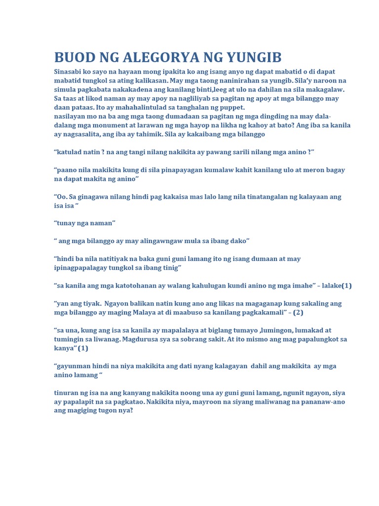 May apoy sa ating likur. BUOD NG ALEGORYA NG YUNGIB Sinasabi ko sayo na hayaan mong ipakita ko ang isang anyo ng dapat mabatid o di dapat mabatid tungkol sa ating kalikasan. 37 Full PDFs related to this paper.