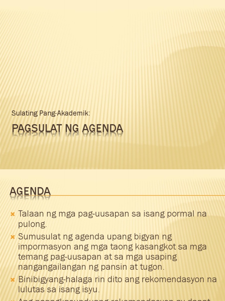 Hello Ako nga pala si Rezl John Tanaya at ngayon ay tatalakayin natin kung ano ang mga dapat tandaan sa Pagsulat ng AGENDAAno ang AGENDA- talaan ng mga paksang tatalakayin ayon sa pagkasunod-sunod sa isang pormal na pagpupulong - mahalagang bahagi ng pagpaplano at pagpapatakbo ng pulong - nakasaad din dito ang mga aksiyon o rekomendasyong inaasahang. Akademikong Sulatin Layunin at Gamit Katangian Abstrak Karaniwang. Ito ang naglalaman ng mga impormasyong importante mga aksyon na dapat gawin tungkol sa mga problemang hinaharap at ang paksa ng talakayan.