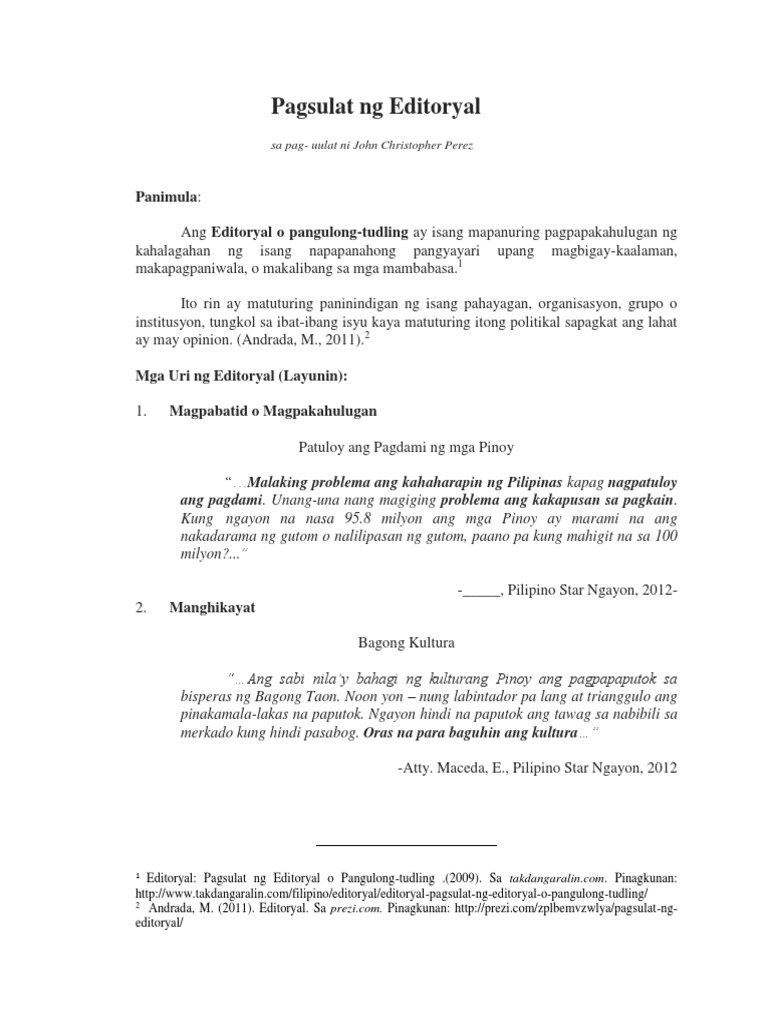Formulari Isang mataas at istandardisadong pasulat katulad ng kasulutan o kasunduan sa negosyo. Pagbuo ng Pananaliksik o Kritikal na Editoryal - Likas na Siyensiya Teknolohiya vs. Maaari kang magsimula sa isang malalim na tanong isang quote o maaari mong buod ang nais ng iyong editoryal.