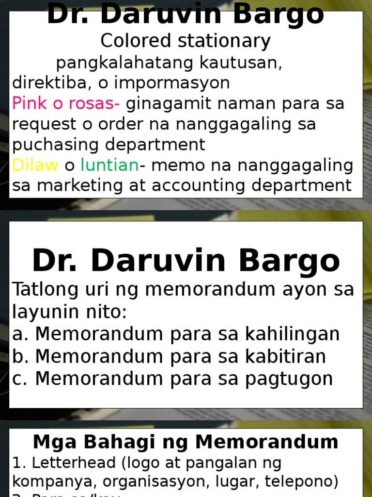 Ang memorandum o memo ay isang kasulatang nagbibigay kabatiran tatlong uri ang memorandum ayon kay bargo. - Naipapakita ang kahalagahan ng uri ng pangungusap ayon sa kayarian sa pamamagitan ng paglalahad.