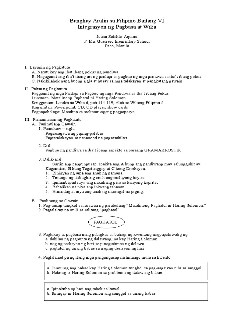 Banghay Aralin Sa Filipino Baitang Vi Integrasyon Ng Pagbasa At Wika Pdf